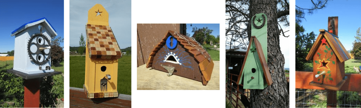 These birdhouses were built from remnants of fence boards and miscellaneous leftovers that includes tiles, odds n’ ends accessories, stains, paints, and other crafty objects. Look closely. You will recognize common household items incorporated into the fun!