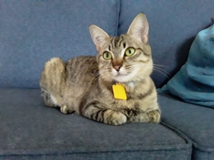 I first saw him stare at me from the Humane Society adoption web page. When I went to adopt, the staff asked which pet I was inquiring about. I told them. They showed me all the cats leaving him last. As it was revealed, he had a very rough start. Born into a hoarders house, now 8 months, he was part of an extreme mission to rescue 120 cats of assorted ages, along with several dogs. The task was so large the humane society worked it in groups. Orbit was in treatment, a resident there for quite awhile as he had multiple issues.