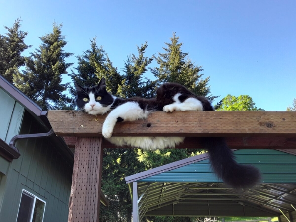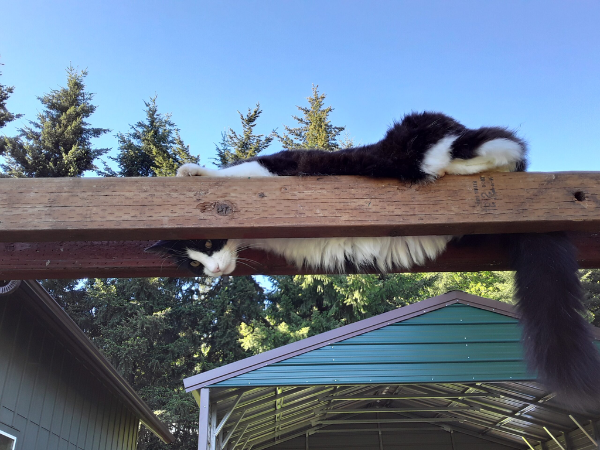 When we moved from the fire regions of southern Oregon north he was the one to help Lunar adapt easily. Lunar, the nurse, was always concerned for Orbit. But our zen master helped Lunar to adjust in the new spots. When we finally landed onto my property and set up RV living, both cats loved it. Tiny spaces to hide. Window views right from the counters and table. My cozy bed at night. What more could a cat want? I built them a pen right off the back as there was an exit door. Orbit continued his zen sitting, as Lunar figured out every angle to climb out just to be on the other side.